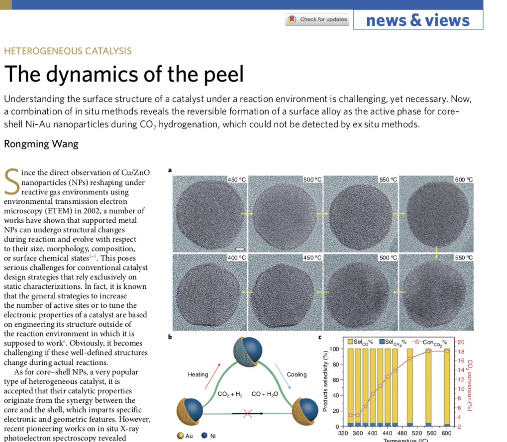 先进功能材料制备与表征团队负责人王荣明教授针对当前反应环境下催化剂的表面结构理解的难题,在Nature Catalysis 3 (2020) 333-334发表News & Views论文“The dynamics of the peel”,就近期发表在该期刊上的论文“Reversible loss of core-shell structure for Ni-Au bimetallic nanoparticles during CO2 hydrogenation”进行了评论,